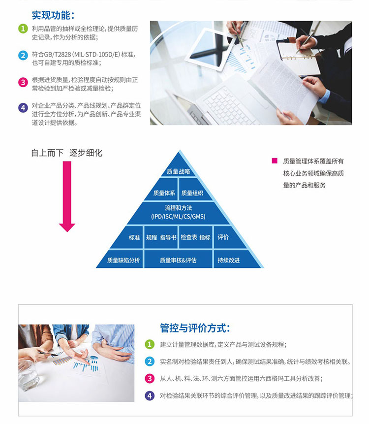 系統特色:實現測試結果自動采集,不良標簽自動打印等,對進料檢驗、制造、驗貨等業務過程的質量監控,基于質量監控規則展開在線預警,同時支持質量改進過程跟蹤管理。